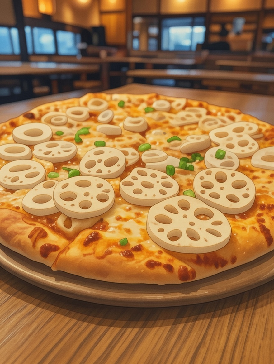Inspired by classic buri-daikon: flaky grilled yellowtail (buri) atop a savory soy-dashi glaze, nestled with melt-in-your-mouth daikon rounds and crisp lotus root slices. A final sprinkle of scallions and ginger adds zing — bold oceanic umami balanced by earthy sweetness, this slice is pure winter nourishment, like a steaming regional hot pot reimagined on pizza.