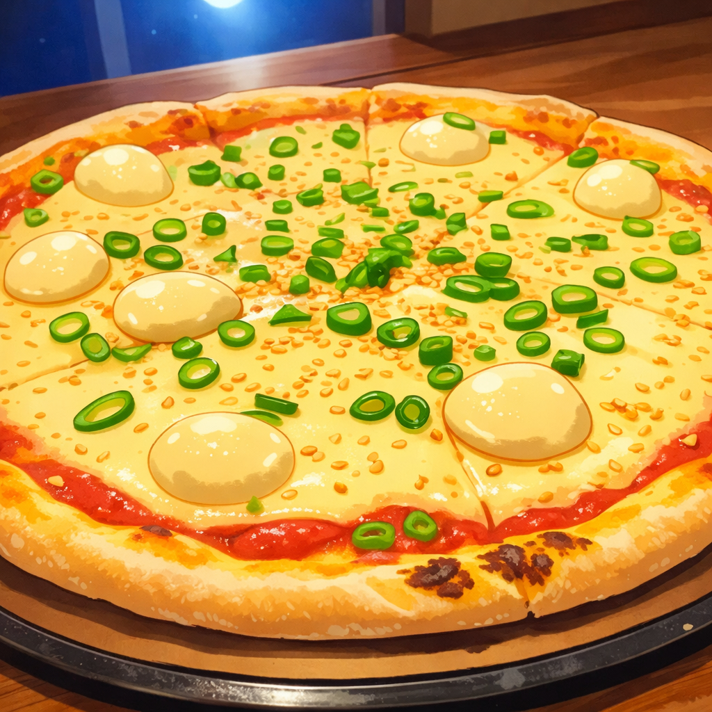 Creamy, spicy mentaiko (pollock roe) sauce blankets the dough, crowned with thinly sliced mochi for chewy texture, fresh scallions, and a generous shower of toasted sesame seeds. The result is a luxurious, oceanic bite with gentle heat and layered umami — ethereal and comforting, as if the moon itself decided to join the pizza party.